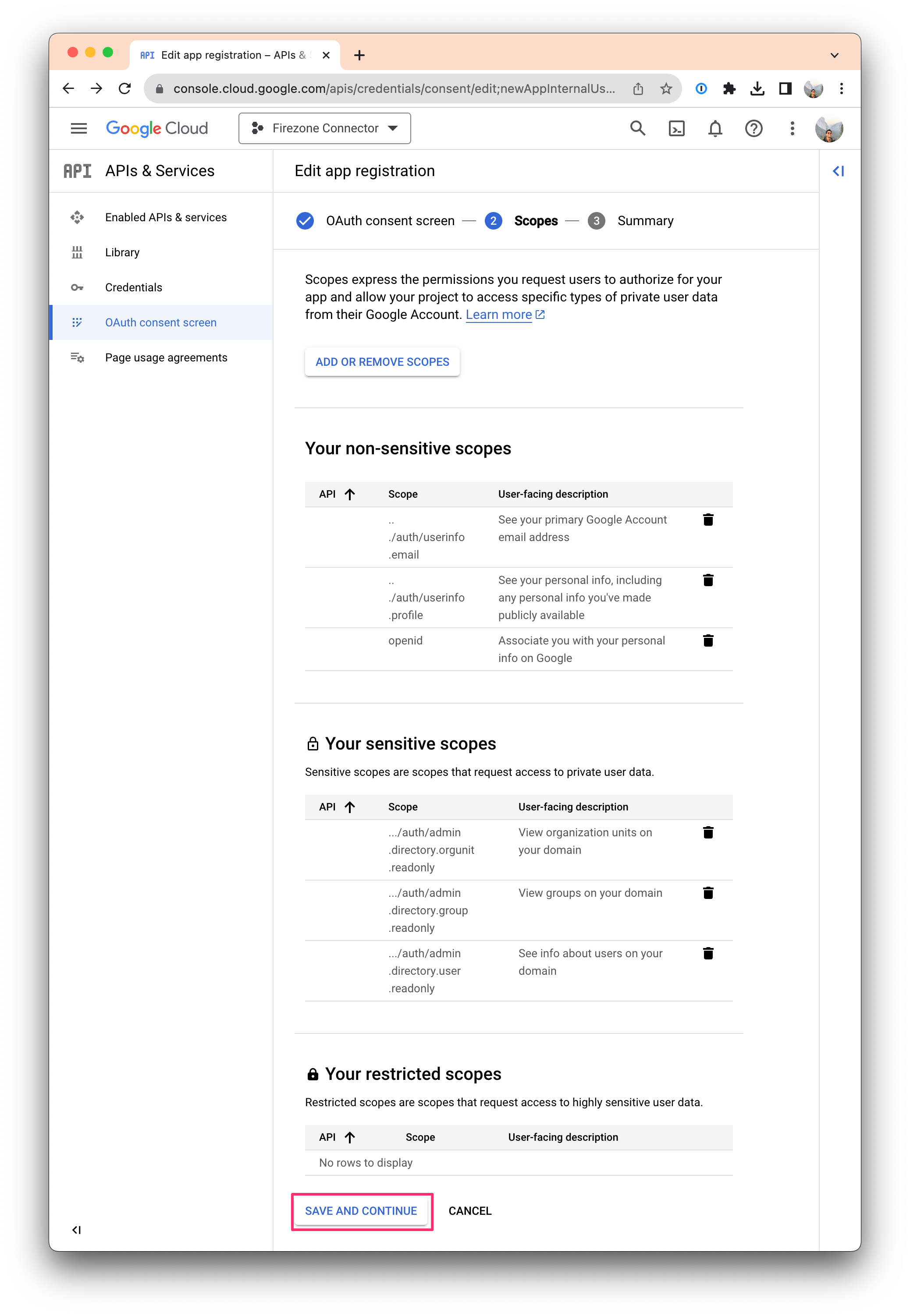 Ensure your Scopes configuration looks like the screenshot above, then click SAVE AND CONTINUE.