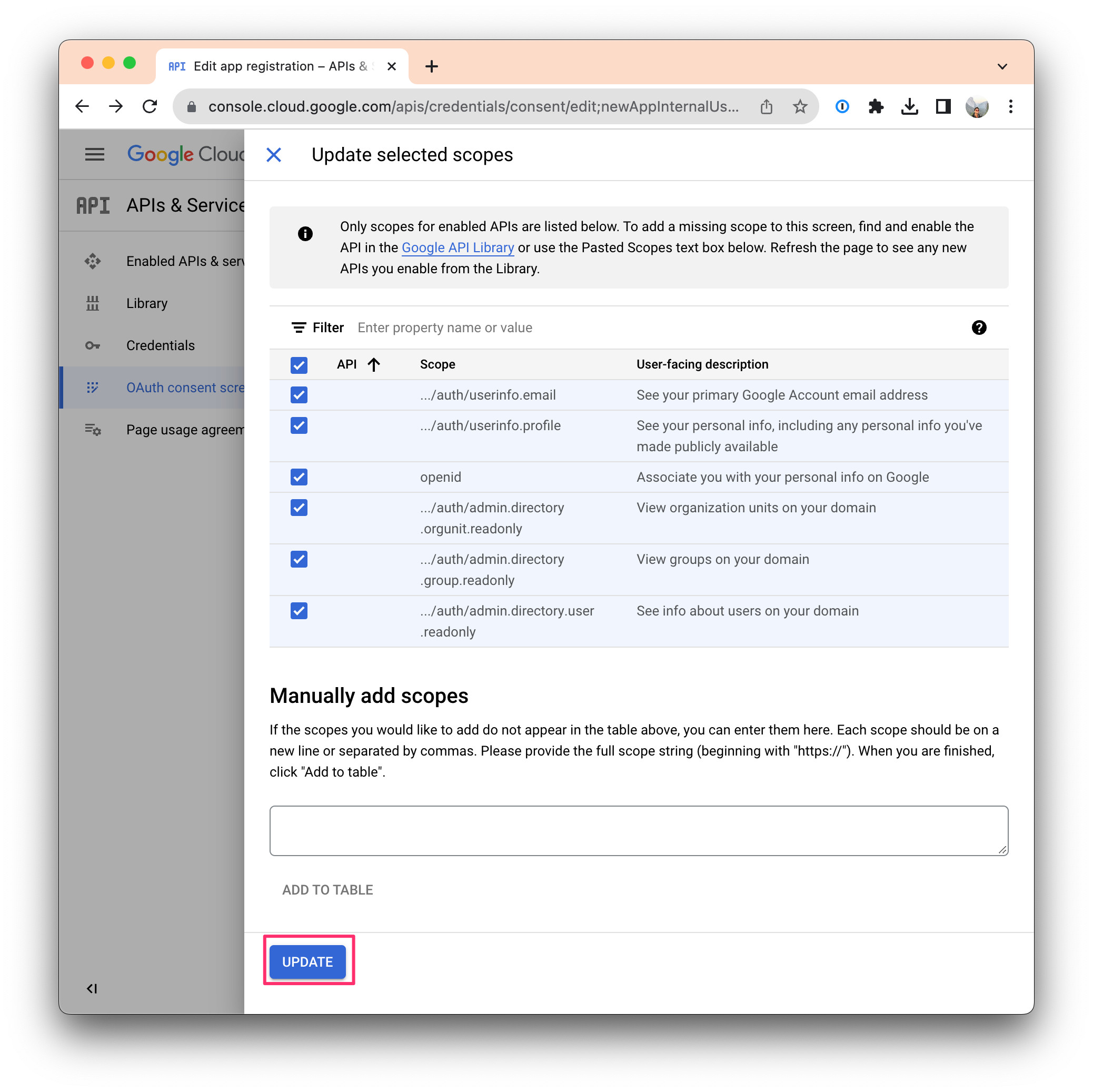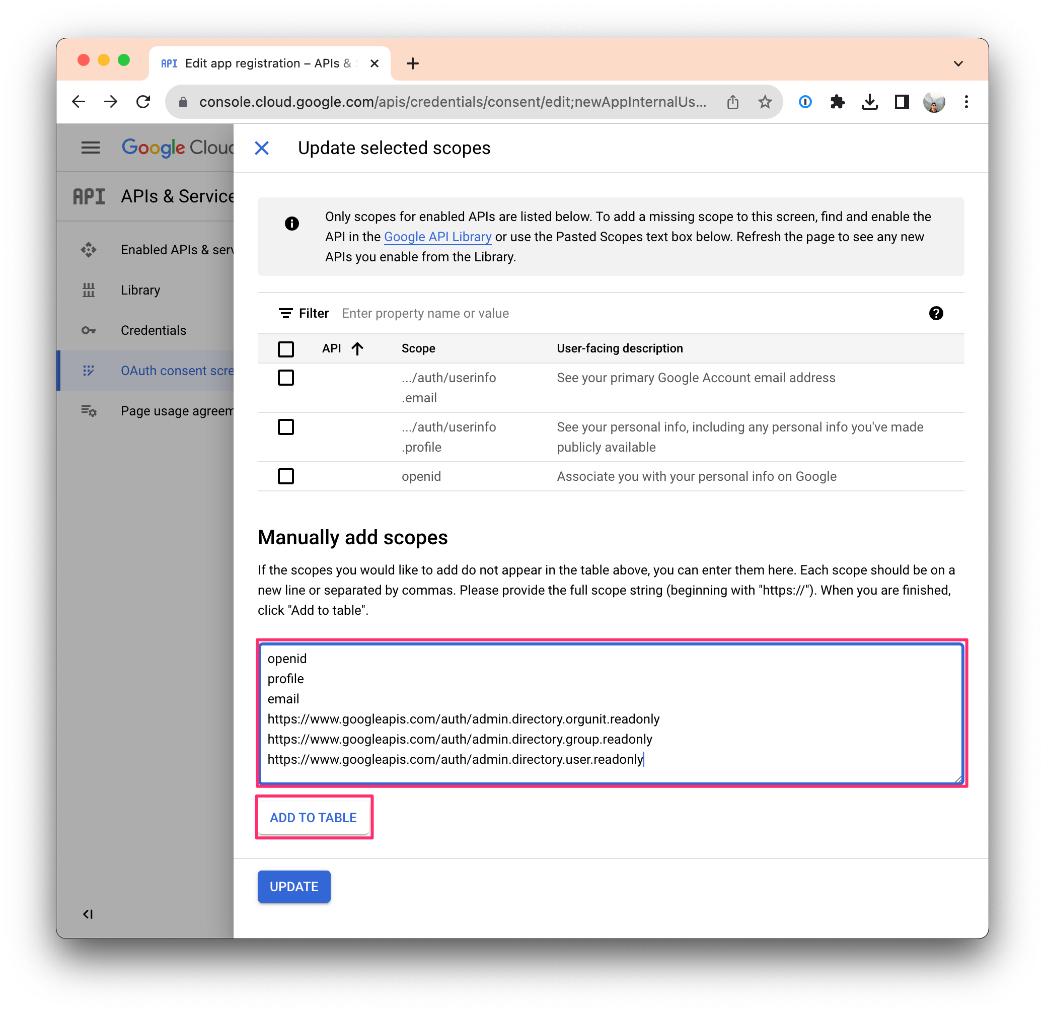 https://www.googleapis.com/auth/admin.directory.orgunit.readonly: Required to sync organizational units.https://www.googleapis.com/auth/admin.directory.group.readonly: Required to sync groups.https://www.googleapis.com/auth/admin.directory.user.readonly: Required to sync users.